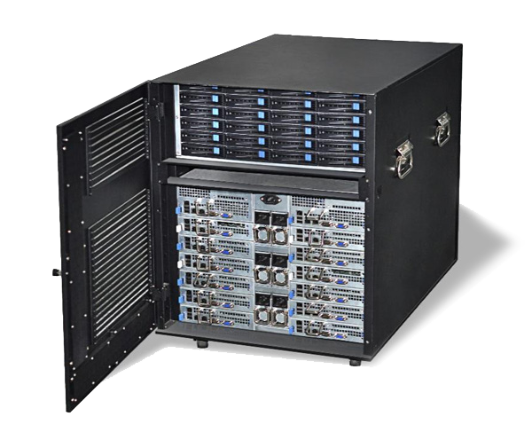U钱包国际(中国)融合一体机就是解决环境使用问题而推出的综合性计算产品,它不需要专业的机房设施,不需要专业的配电和空调设备,放在办公室或实验室接墙电就可使用, 具有低噪音、低功耗等特点。最高可以安装14个双路XEON E5 处理器的刀片服务器,48个外置热插拔硬盘存储,内置一个万兆网络交换机安装空间,带有整体状态显示和控制系统,内部散热和防尘处理。专为办公室应用环境 设计,它在众多方面超越了传统机架式服务器、刀片服务器和机群服务器,是高稳定、高性能、低环境要求的新一代桌边型高性能计算机。它采用整体优化的设计, 有效降低了系统功耗,再加上其人性化的设计、很强的系统扩展能力、卓越的性价比和计算密度,可以覆盖更广泛的个人及工作组用户对高性能计算的需求,与传统 的高性能计算机相比,U钱包国际(中国)融合一体机可给予更有竞争力的整体解决方案,是更好满足中小高性能计算需求的理想平台。下图为14个刀片打开效果图: